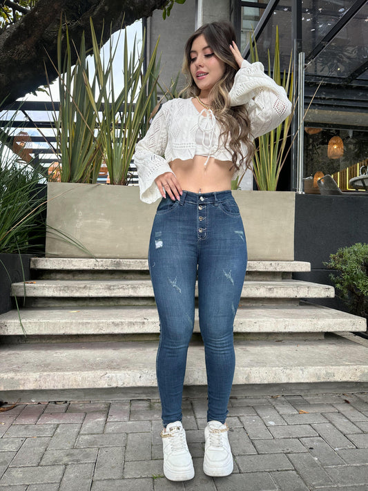 Jean skinny mujer tiro alto levanta cola tono azul oscuro con rotos