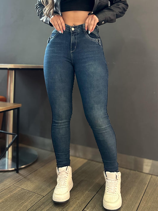 Jean skinny mujer tiro alto levanta cola tono azul oscuro
