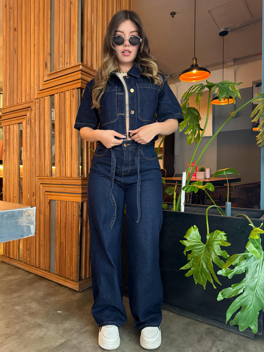 Jean wide leg mujer tono azul oscuro con correa