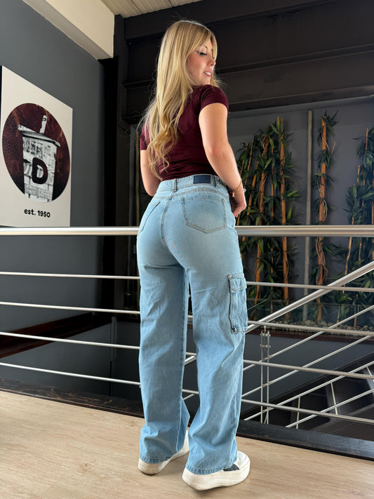 Jean cargo mujer tono azul claro con ajuste cintura