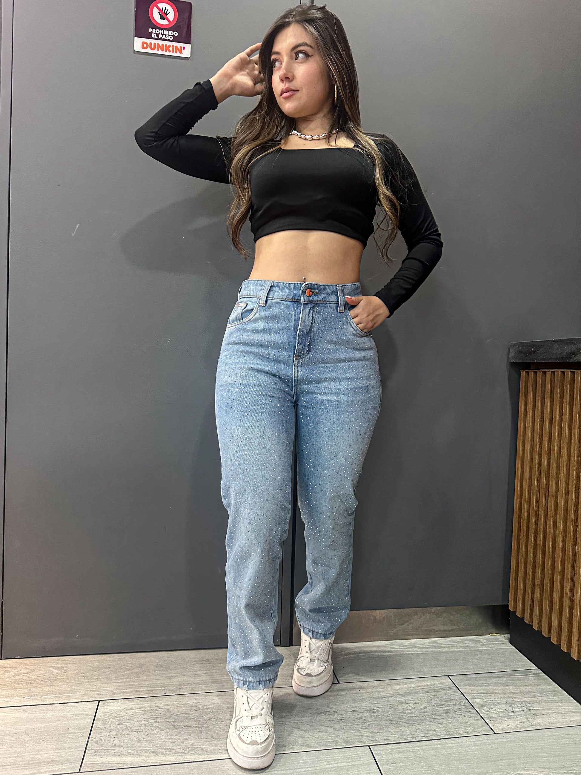 El Jean Boyfriend europeo tono claro es perfecto para un look moderno. Confeccionado en jean rígido, con brillos en la parte frontal y con un bolsillo con detalles brillantes en la parte trasera, su silueta Boyfriend ofrece comodidad y estilo.