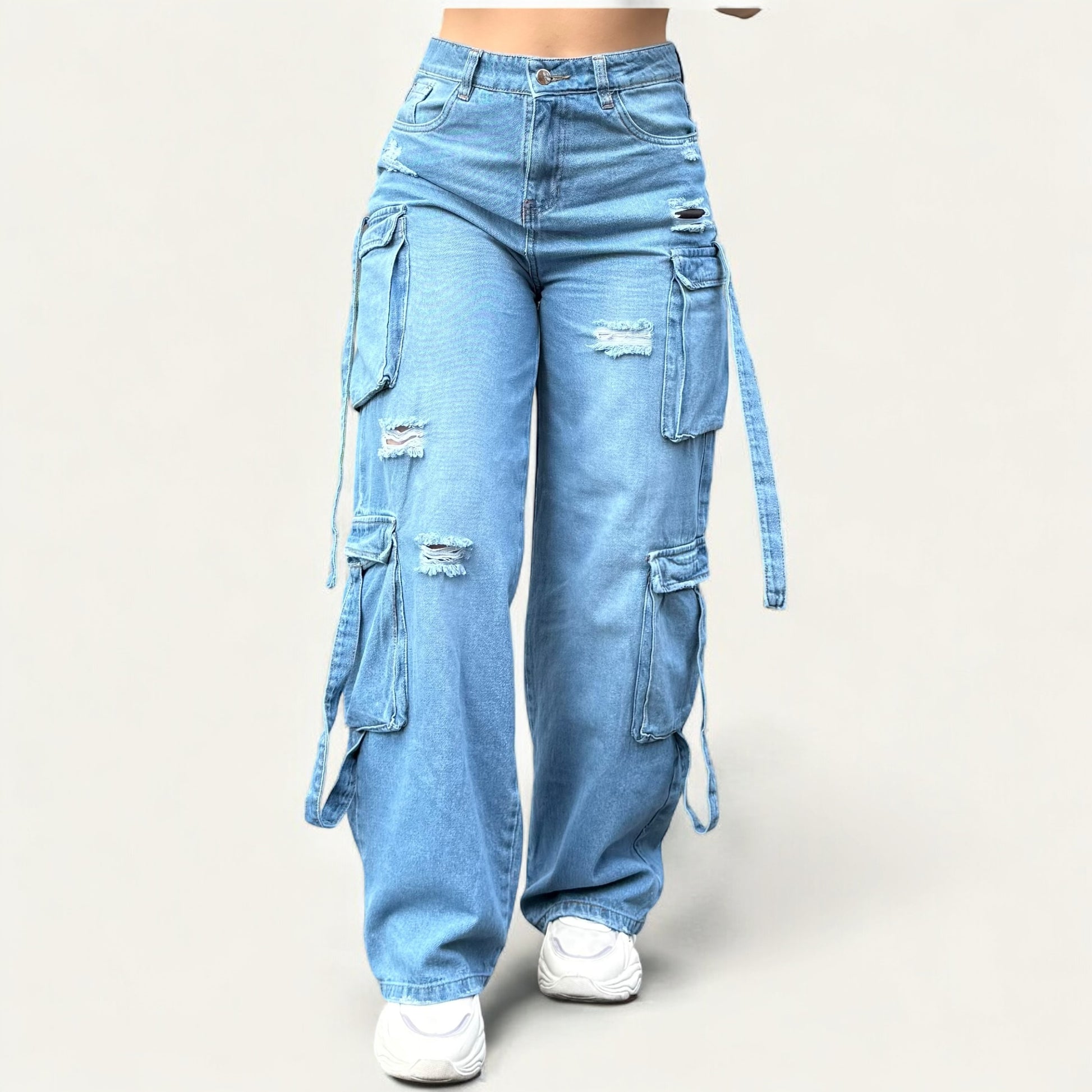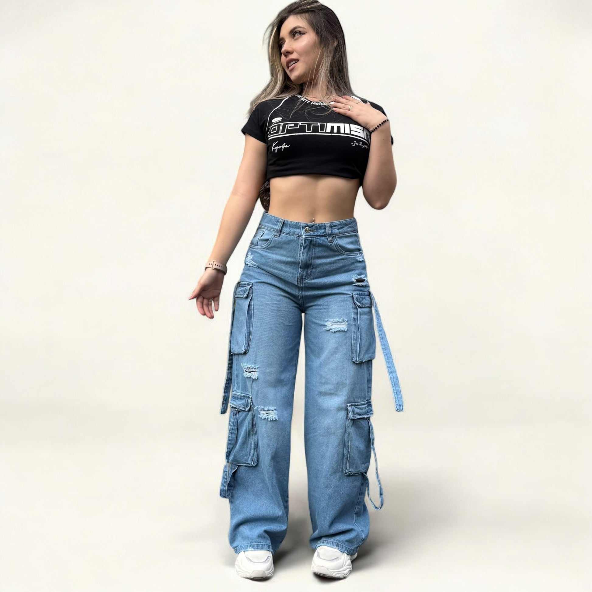 Nuestro cargo tono azul claro combina lo mejor del estilo con la comodidad del denim. Su corte wide leg y los múltiples bolsillos laterales lo hacen práctico y moderno, mientras que los rotos estratégicos le aportan ese look atrevido que marca tendencia.