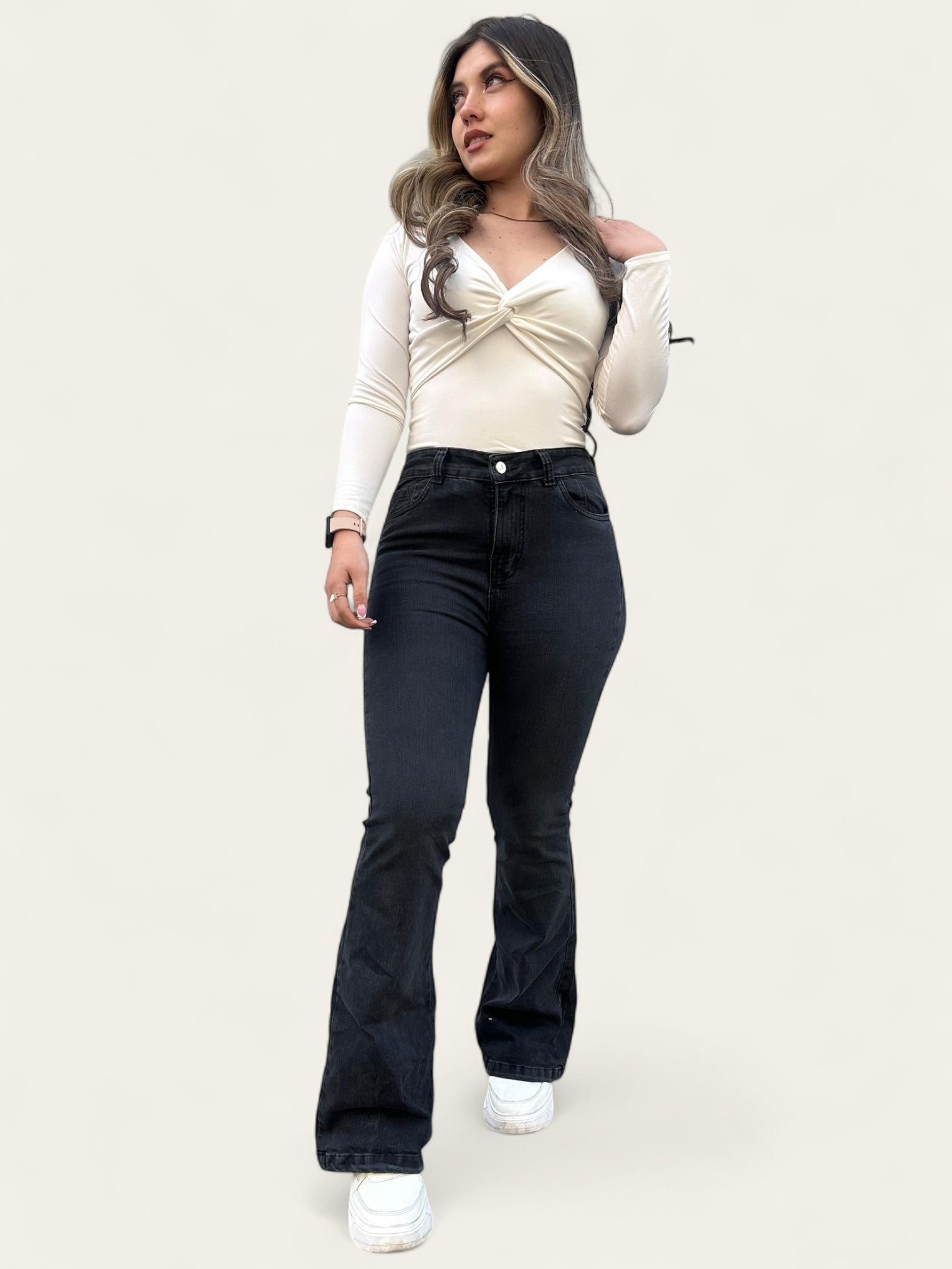 Descubre nuestro Jean flare, una prenda diseñada para realzar tu figura con comodidad. Su horma acentúa la cintura y caderas, mientras que el corte flare ajustado hasta la rodilla y sutilmente suelto hacia el tobillo genera una sensación de longitud en las piernas y un efecto visual.