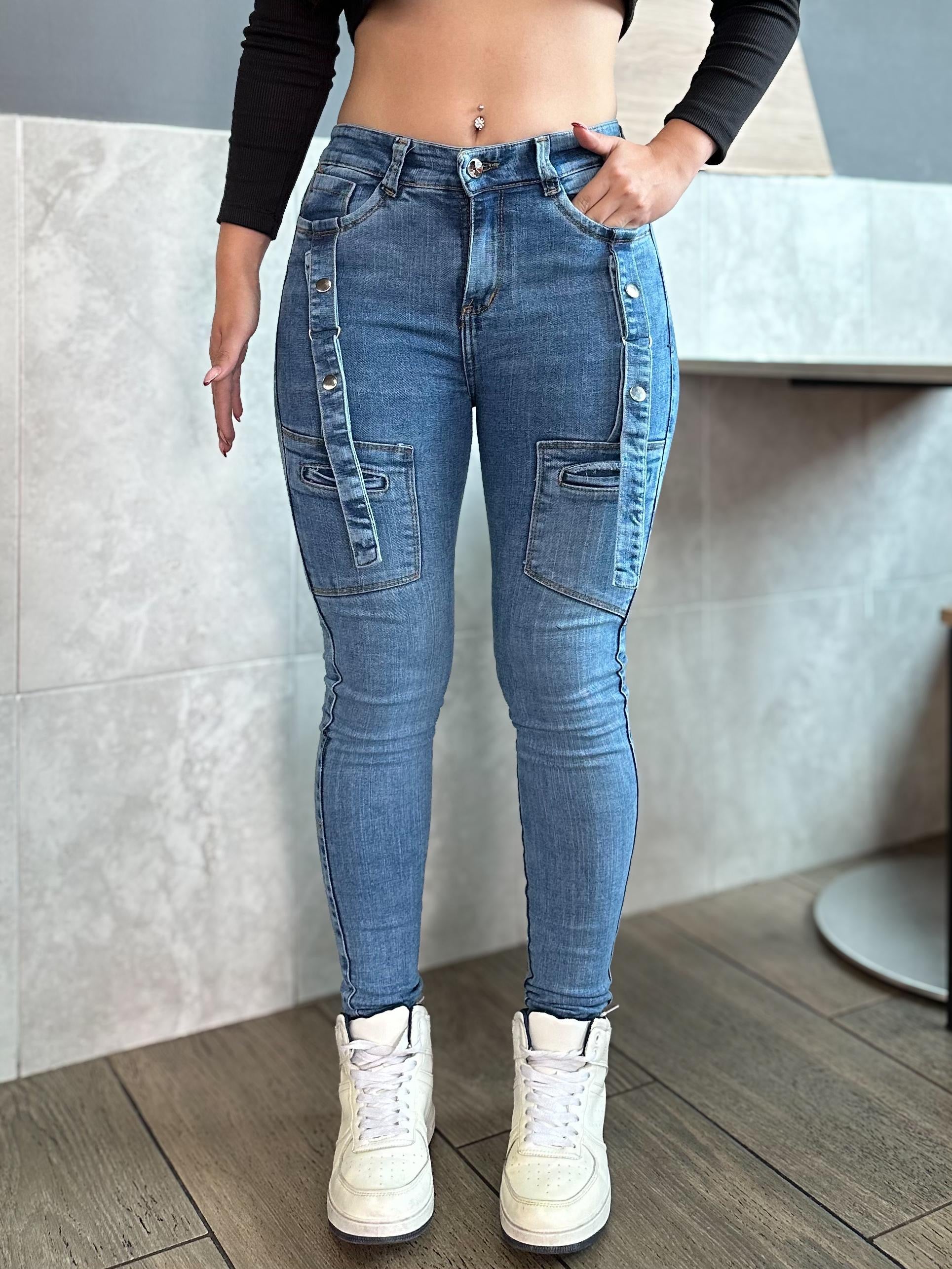 Jean skinny mujer con correas tiro alto levanta cola tono azul medio