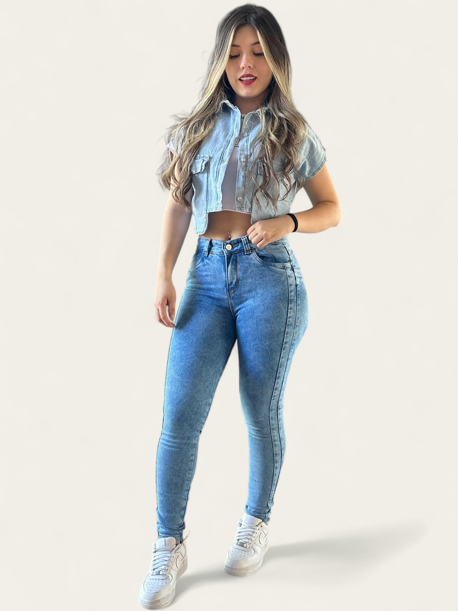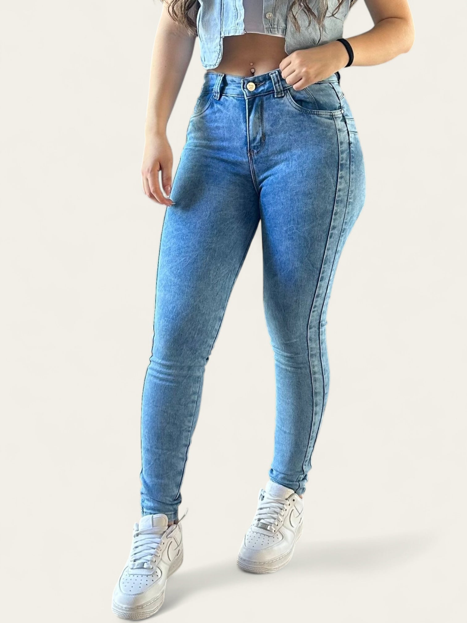 Jean skinny tiro alto mujer strech levanta cola tono azul fros