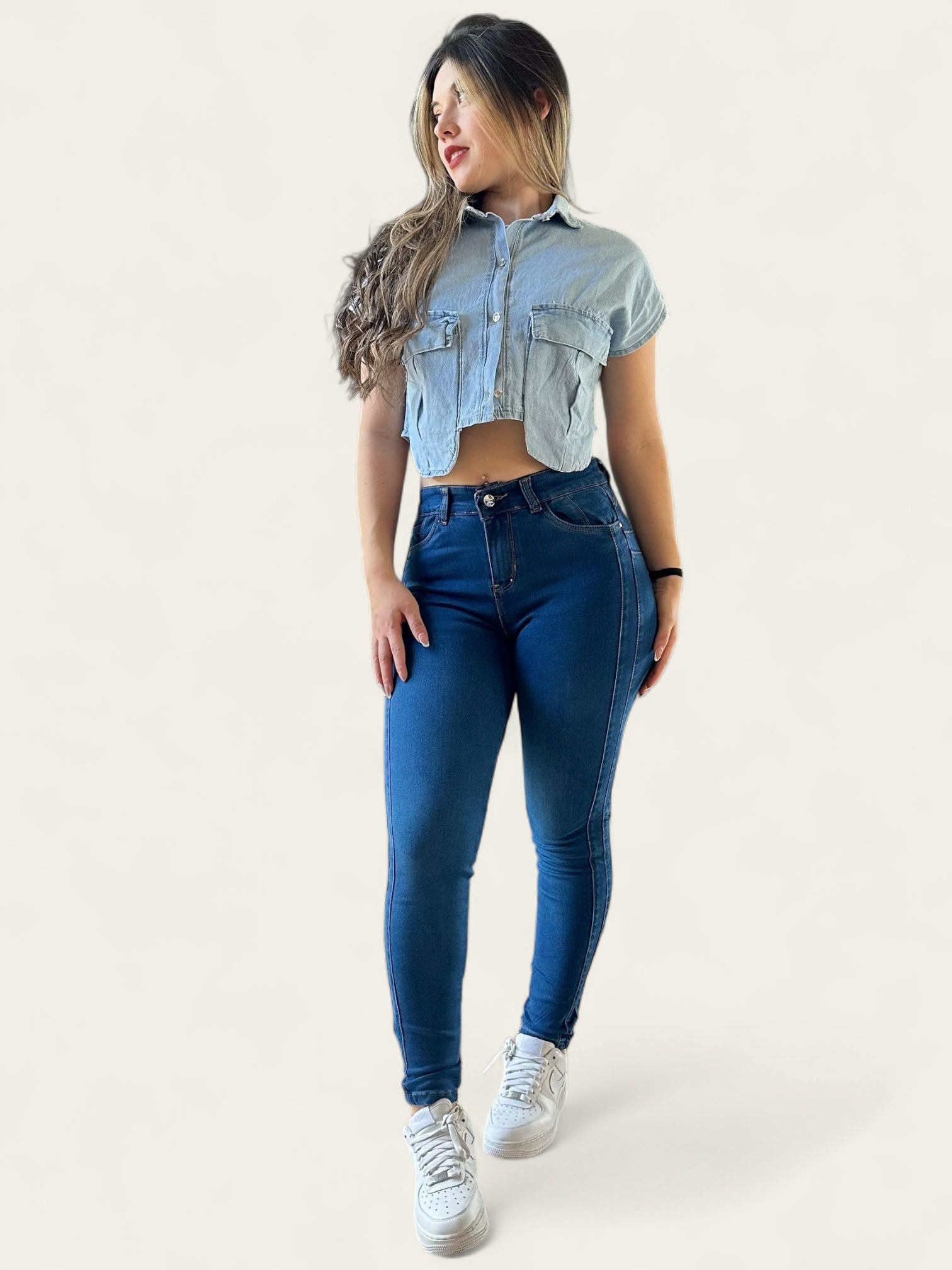 Jean skinny tiro alto mujer strech levanta cola tono azul medio